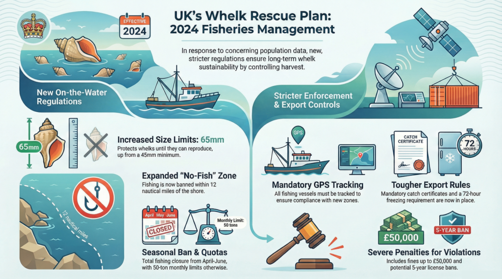 By 2020s, UK scientists saw concerning data across multiple whelk fisheries. In December 2023, the government released its first Whelk Fisheries Management Plan, explicitly citing “increased fishing pressure driven largely by Asian export demand.”